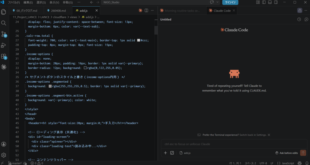Claude Codeはターミナル単体でも動くが、VS Code拡張機能を入れると格段に快適になる。ファイルの変更がエディタ上でリアルタイムに確認でき、コードを選択してそのままClaude Codeに渡せるため、開発の流れが途切れない。