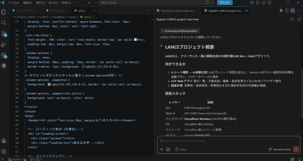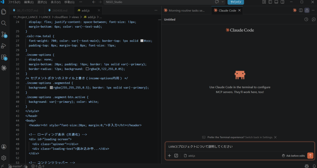 - コードの自動生成・編集 — 「ログイン機能を追加して」と言えば、必要なファイルを作成・編集